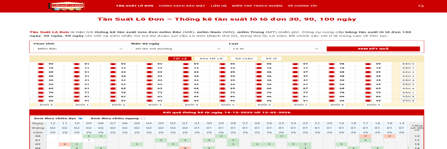 Tần Suất Lô Đơn là tiện ích thống kê tần suất loto đơn miền Bắc (MB), miền Nam (MN), miền Trung (MT) miễn phí. Công cụ cung cấp bảng tần suất lô tô đơn 100 ngày, 30 ngày, 90 ngày chi tiết và sớm nhất.